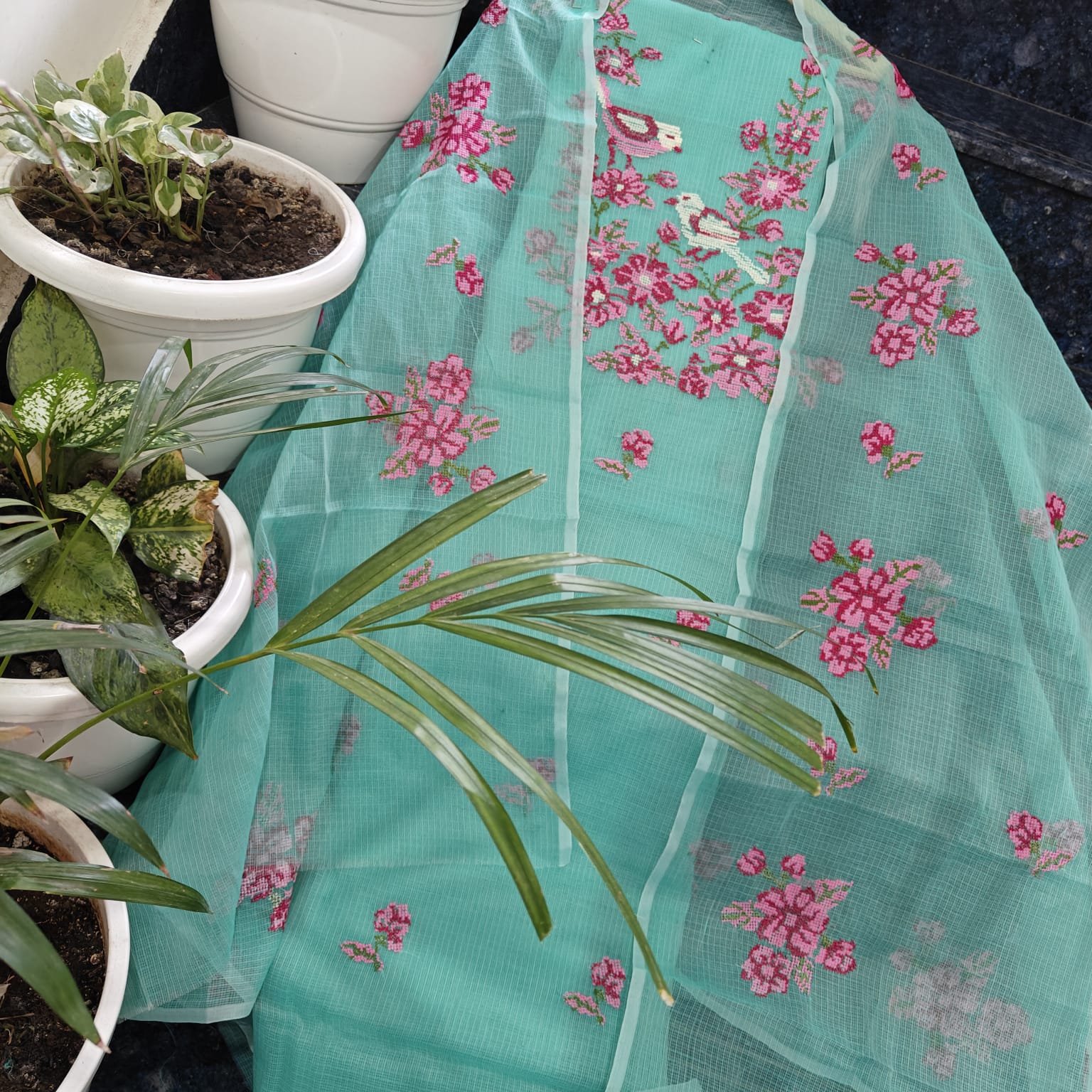 Soft silk kota hand kantha work 4 piece set Top duptta bottam lining